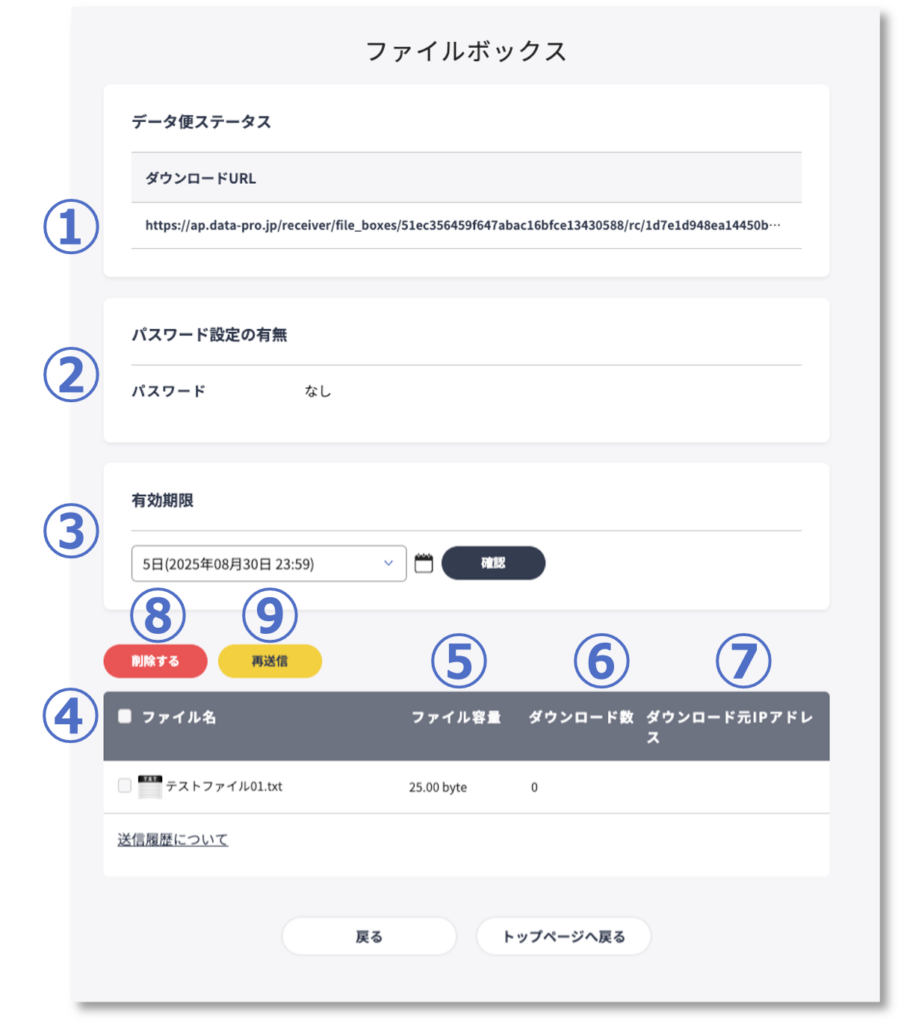 有効期限内のダウンロード URLが表示されます。※セキュリティ便の場合は、ステータスが表示されます。