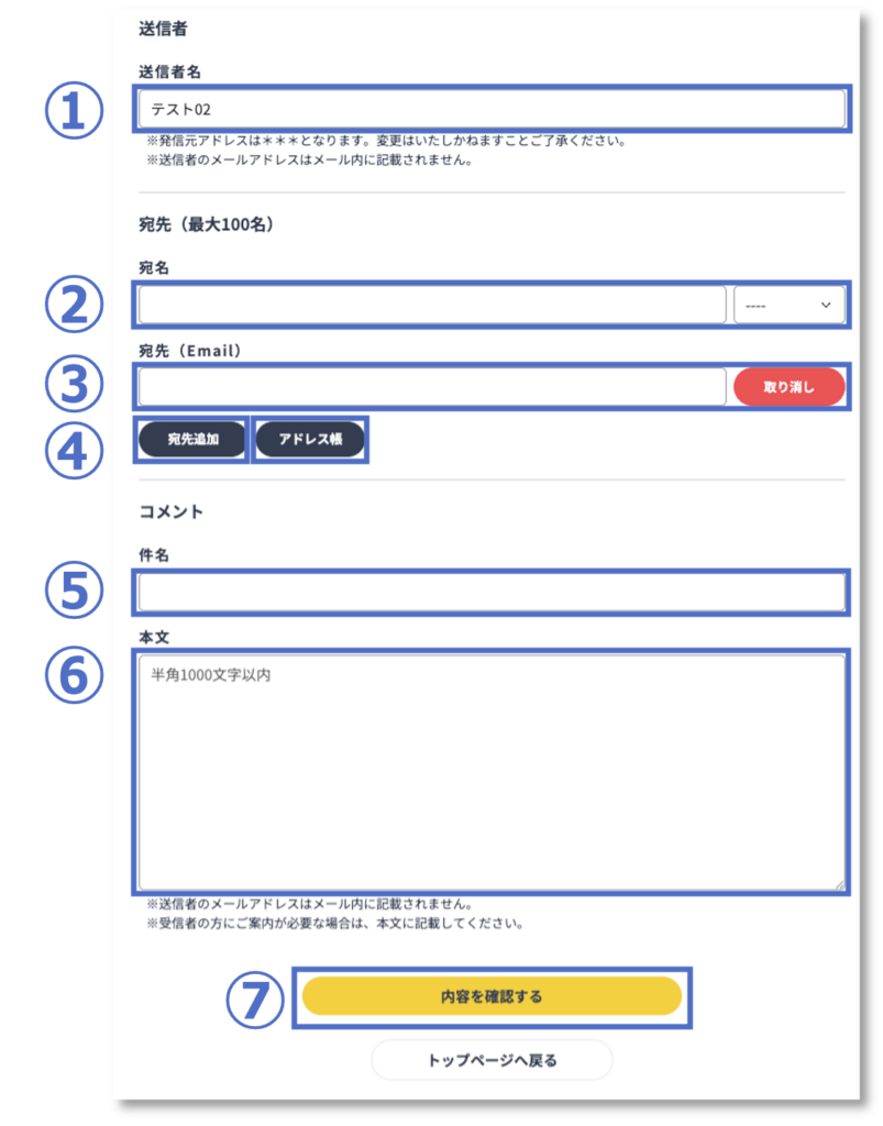 ※宛先は①つ以上設定されていれば、②つ目以降が空欄でも送信可能です。